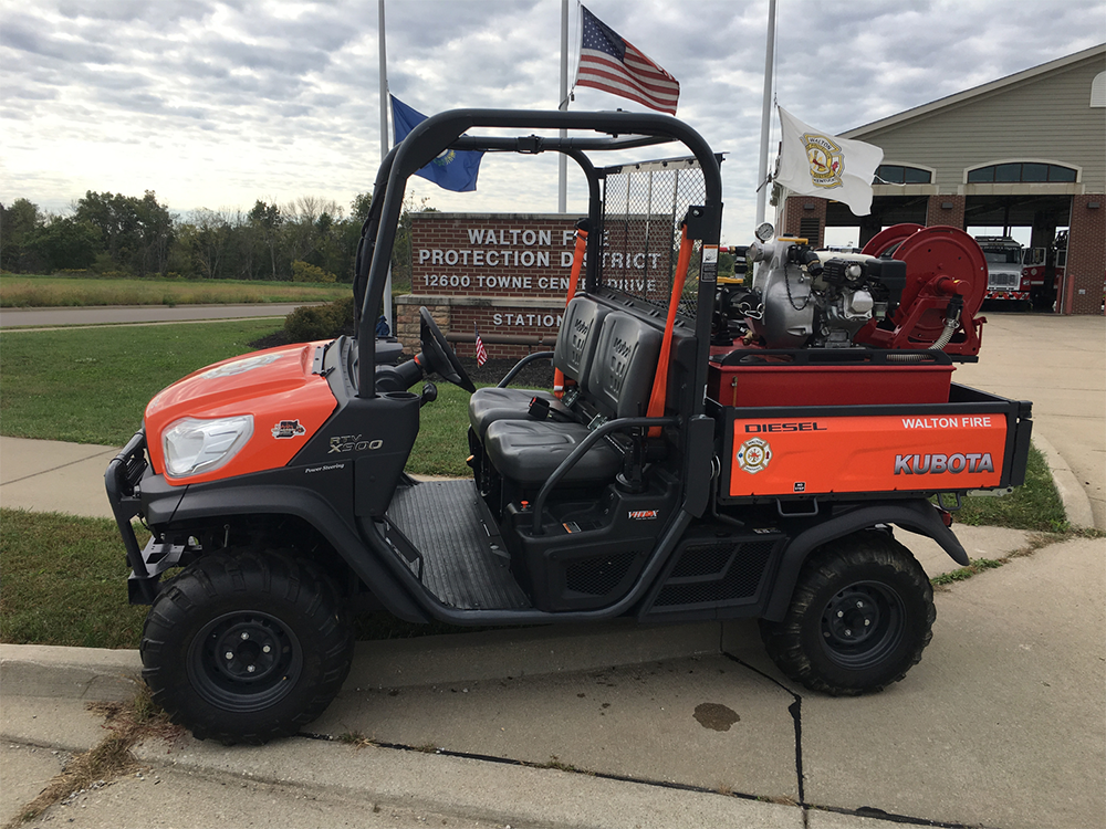 Kubota 1 is a RTVX900 Kubota that has independent rear suspension. A place for a backboard. A honda gx pump is used to pump 4 gallons foam, and 20 gallons water that is hauled on the Kubota a 20-foot garden hose is used to extinguish wildland fires that are unable to be reached by our brush truck. The skid unit is bolted into the bed to be taken out when not needed. This Unit and its trailer are located at Station 91“